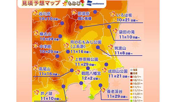 不過長野與群馬有些因為地形較山地大致10月底到11月上旬
