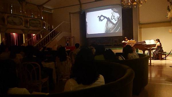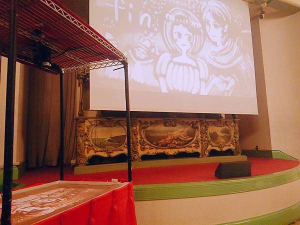 大螢幕上還有沙畫的表演 , 講著白雪公主的故事,用音樂及沙畫呈現